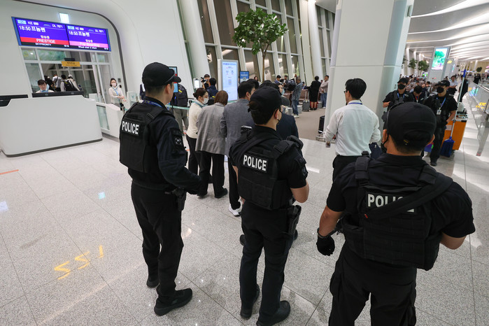 | ▲ 캄보디아에서 한국인 납치·구금 사태가 발생해 논란을 빚고 있는 가운데 지난 15일 인천국제공항 제2여객터미널 탑승구에서 인천국제공항 경찰단 대테러기동대 대원들과 안보팀 관계자들이 캄보디아행 항공편 한국인 승객들을 대상으로 위험방지를 위해 질의응답 등 안전활동을 하고 있다. 2025.10.15 연합뉴스 제공 |