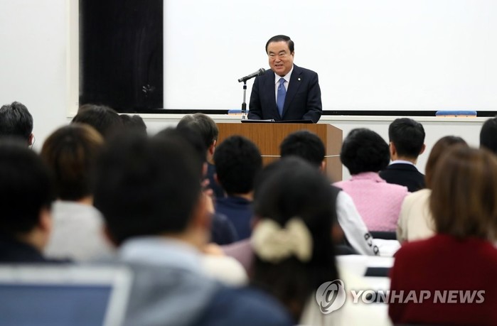 일본을 방문 중인 문희상 국회의장이 5일(현지시간) 오후 도쿄 와세다대학교에서 '제2의 김대중-오부치 선언, 문재인-아베 선언을 기대합니다'라는 제목으로 특강을 하고 하고 있다. |