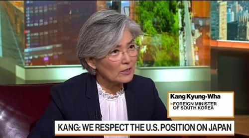 강 장관은 한국 대법원의 강제징용 배상판결과 일본의 수출규제 조치, 우리 정부의 한일군사정보보호협정(GSOMIA·지소미아) 종료 결정 등 한일갈등에 대한 미국의 중재와 관련, "미국은 무엇보다 한일 양측에 대화를 촉구하고 있다"면서 미국은 "눈에 보이는 역할은 하지 않을 수도 있지만, 분명히 하고 있다. (한미일) 삼각 동맹을 강력히 유지하기 위해 할 수 있는 일을 하고 있다"고 전했다.