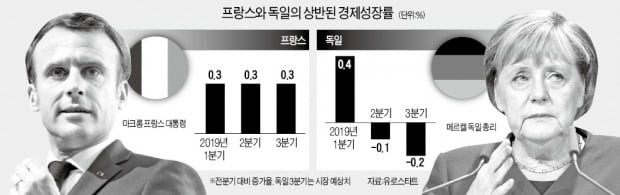 강성노조와 저성장, 높은 실업률로 인해 한때 ‘유럽의 병자’로 불리던 프랑스가 부활하고 있다. 세계 경기 둔화에도 프랑스는 양호한 성장을 이어가고 있으며 실업률은 떨어지고 있다. 에마뉘엘 마크롱 대통령이 추진한 노동개혁과 친기업정책에 힘입었다는 평가가 나온다. 반면 유럽연합(EU)을 이끌고 있는 독일은 미·중 무역전쟁의 유탄을 맞아 침체에서 헤어나지 못하고 있다.