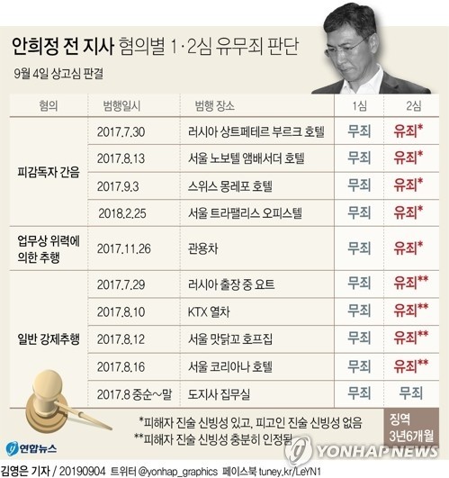 대법원 2부(주심 김상환 대법관)는 9일 오전 10시 10분 대법원 1호법정에서 피감독자 간음, 업무상 위력에 의한 추행, 강제추행 등 혐의로 기소된 안 전 지사의 상고심 판결을 선고한다.