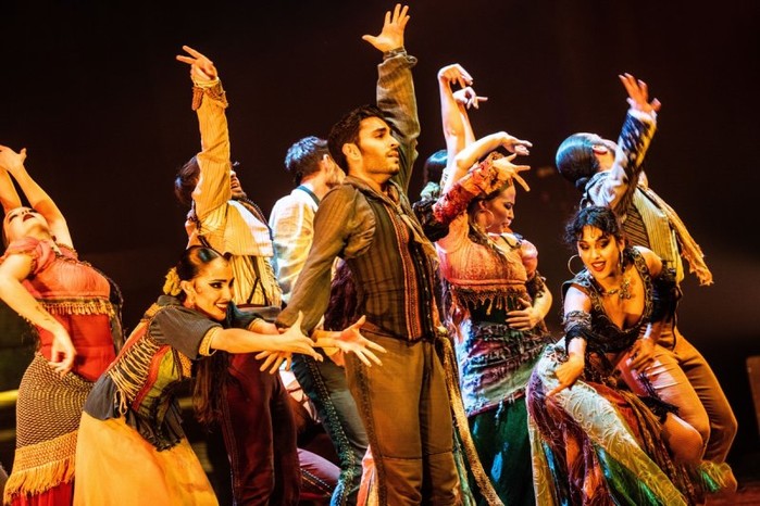 특징은 ‘성 스루(Sung-Through)’ 형식이라는 점이다. 대사가 전혀 없이 40여 곡의 노래로만 전개된다. 프랑스 뮤지컬 특유의 이중 캐스트 구조를 유지한다. 배우는 노래만 부르고, 별도의 전문 무용수가 춤을 춘다. 17명의 플라멩코 댄서가 등장해 음악과 춤이 서사의 중심을 이끈다. 안무가 카를로스 로드리게스는 “플라멩코는 단순한 춤이 아니라 감정의 불꽃이다. 등장인물의 내면을 예고하고, 사랑과 분노를 시각화한다”고 말한다.