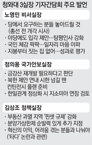 노 실장이 공개 석상에서 총선과 연계된 개각과 청와대 개편 구상을 일부 내비치면서 향후 청와대 행보가 주목된다.