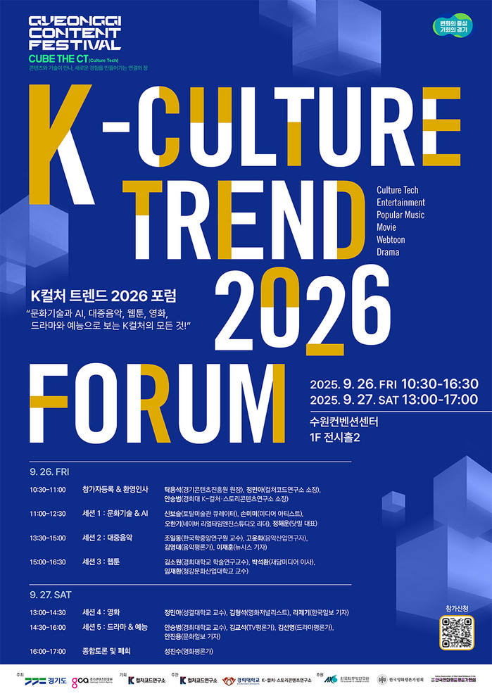 [뉴스타임스 = 우도헌 기자] 대중문화는 음악, 영화, 웹툰, 예능은 물론이고 이제는 AI와 문화기술(CT: Culture Technology)이 그 축을 이루며 산업과 예술의 경계를 허물고 있다. 지난 9월 26일부터 27일까지 수원컨벤션센터에서 열린 ‘제4회 K컬처 트렌드 포럼’은 바로 이러한 시대의 변화를 포착한 자리였다.