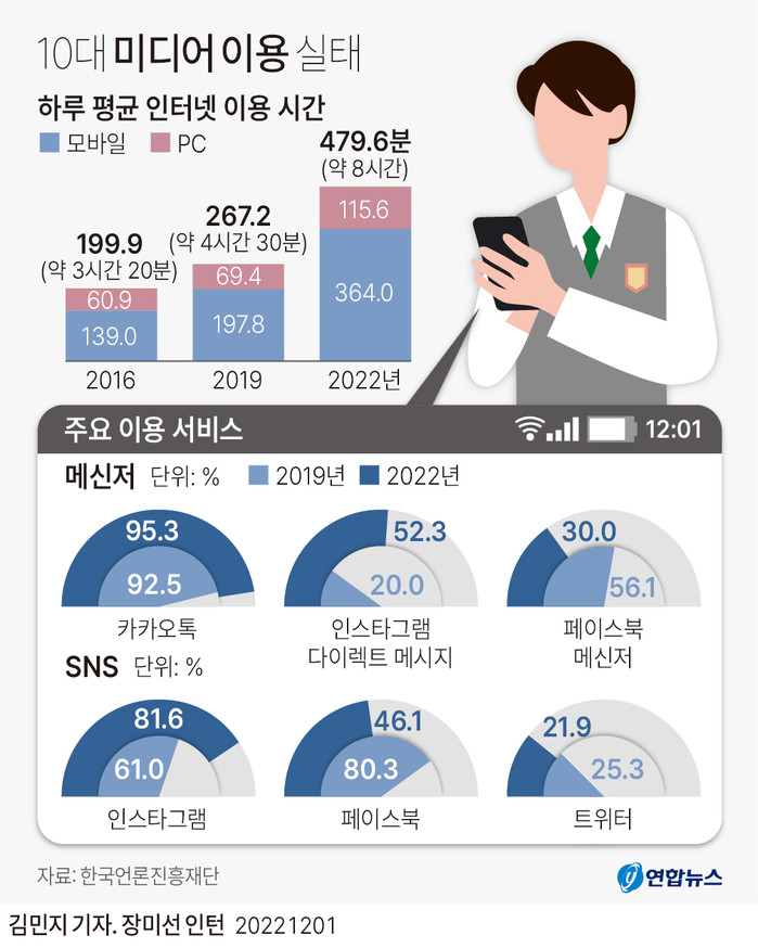 한국정보화진흥원의 ‘2024 청소년 디지털 이용 실태조사’에 따르면 국내 중·고등학생의 하루 평균 스마트폰 사용 시간은 4시간 27분이며 이 중 절반 이상(약 2시간 50분)이 SNS와 영상 플랫폼(인스타그램·틱톡·유튜브 쇼츠 등)에 쓰인다. 여학생의 SNS 사용률이 남학생보다 20% 이상 높으며, 10명 중 6명은 “SNS를 그만두고 싶어도 그럴 수 없다”고 답했다.