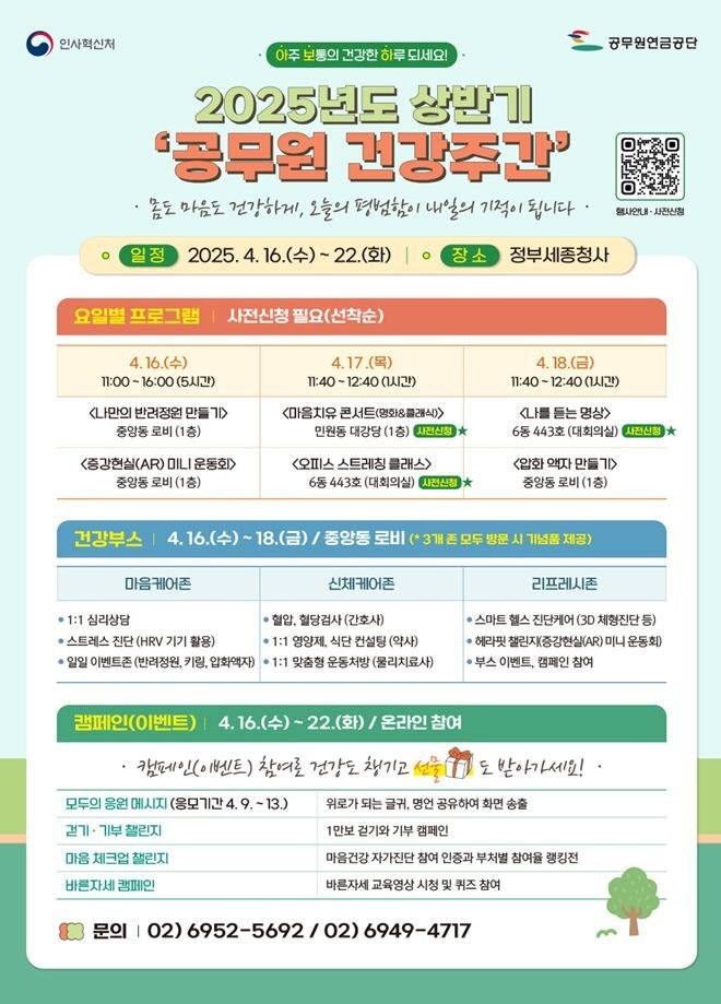[뉴스타임스 = 우도헌 기자] 공무원들의 신체적·정신적 건강을 증진하기 위한 ‘공무원 건강 주간’ 행사가 전국 단위로 확대된다. 인사혁신처는 27일부터 내달 4일까지 세종, 대전, 제주 등지에서 ‘2025 하반기 공무원 건강 주간 행사’를 개최한다. 기존 세종 중심의 행사에서 벗어나 지역을 확대한 이번 행사는 공직자들에게 일상 속 휴식과 심리적 회복의 기회를 제공하기 위해 마련됐다.