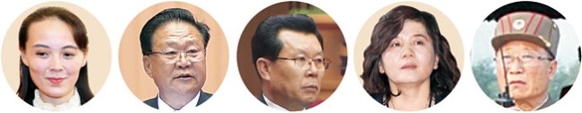 | ▲ 왼쪽부터 김여정 노동당 선전선동부 제1부부장, 최룡해 최고인민회의 상임위원장, 김재룡 내각 총리, 최선희 외무성 제1부상, 전일호 상장 (국방 과학자). |