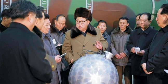 | ▲ 김정은 북한 국무위원장이 2016년 3월 핵무기 병기화 사업 현장에서 핵탄두 기폭장치로 추정되는 구형 물체 앞에서 사업 지시를 하고 있다. 연합뉴스 |