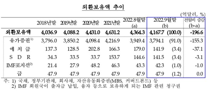 한은이 6일 발표한 외환보유액 통계에 따르면 9월 말 기준 외환보유액은 4천167억7천만달러로, 8월 말(4천364억3천만달러)보다 196억6천만달러나 줄었다.