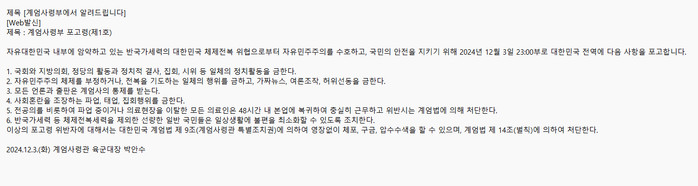 박 총장은 "자유대한민국 내부에 암약하고 있는 반국가세력의 대한민국 체제전복 위협으로부터 자유민주주의를 수호하고, 국민의 안전을 지키기 위해 2024년 12월 3일 23시부로 대한민국 전역에 다음 사항을 포고한다"며 이같이 밝혔다.