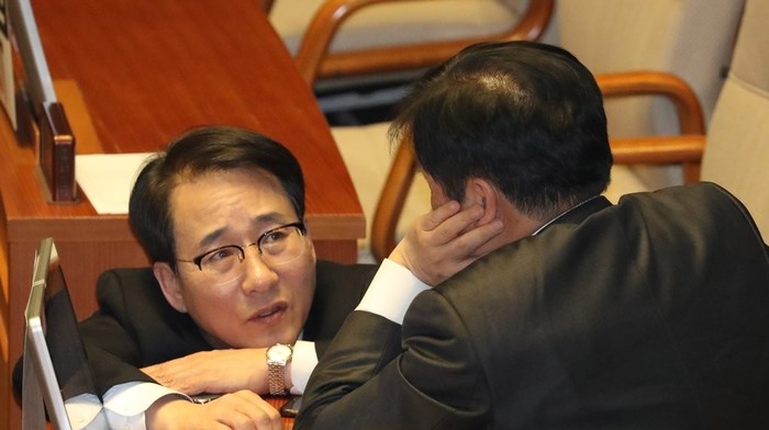 | ▲ 더불어민주당 이원욱 원내수석부대표(왼쪽)와 자유한국당 이진복 의원이 24일 오후 국회 본회의장에서 이야기를 나누고 있다. 연합뉴스 제공 |