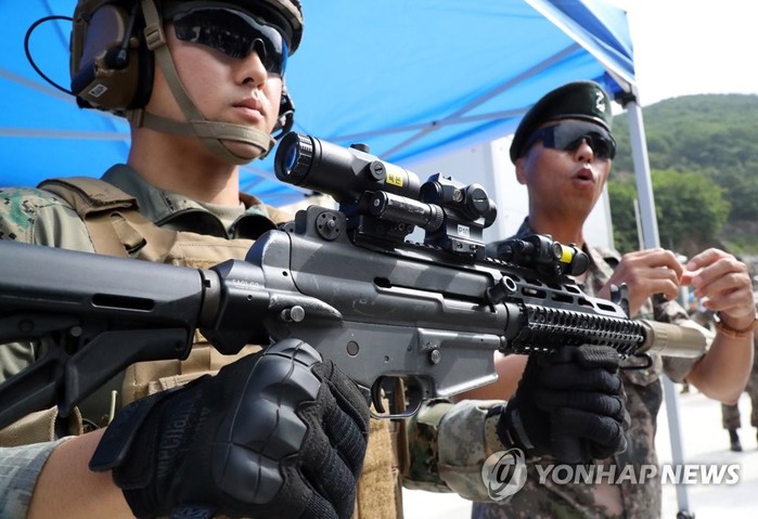 지난 6월 20일 인천광역시 국제평화지원단에서 군 관계자가 워리어플랫폼을 소개하고 있다. 워리어플랫폼은 전투복, 전투화, 방탄복, 방탄헬멧, 소총 등 33종의 전투 피복과 전투 장비로 구성된 개인 전투수행체계로 작전 수행능력을 향상시켜준다 |