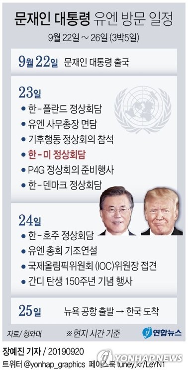 문대통령은 또 안토니우 구테흐스 유엔 사무총장과의 면담, 구테흐스 사무총장이 주최하는 기후행동 정상회의 참석 등의 일정도 소화한다.