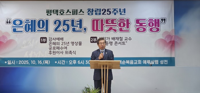 평택호스피스선교회(이사장 배창돈 목사. 대표 박종승 목사)는 지난 2025년10월16일(목)오후6시30분 평택순복음교회(담임목사 강헌식, 경기도 평택시 서재 11로 40) 예루살렘 성전에서 정장선 평택시장과 서현옥 경기도의회 의원. 강정구 평택시의회 의장 등 100여명의 내빈이 참석한 가운데 평택호스피스선교회 25년의 은혜, 창립 25주년 감사예배를 성대하게 열고 마쳤다.