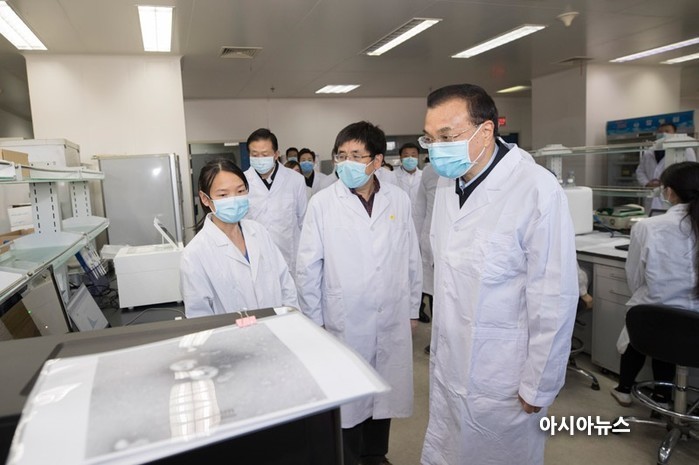 | ▲ 신종 코로나바이러스 감염증에 대한 중앙 실무 그룹 지도자인 리커창 중국 국무원 총리가 30일 전염병 예방 및 통제에 대한 과학적 연구 상황을 조사하기 위해 현지 질병 통제 및 검사센터를 방문해 전문가 의견을 경청하고 있다. 중국 국무원 제공 |