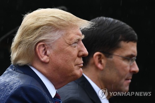 | ▲ 도널드 트럼프 미국 대통령(왼쪽)과 마크 에스퍼 국방장관(오른쪽)이 버지니아주에서 신임 합참의장 취임식에 참석하고 있다. |