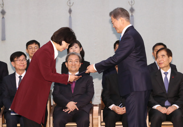 ▲ 문재인 대통령이 2일 오후 청와대에서 추미애 법무부 장관에게 임명장을 수여하고 있다. 연합뉴스 제공