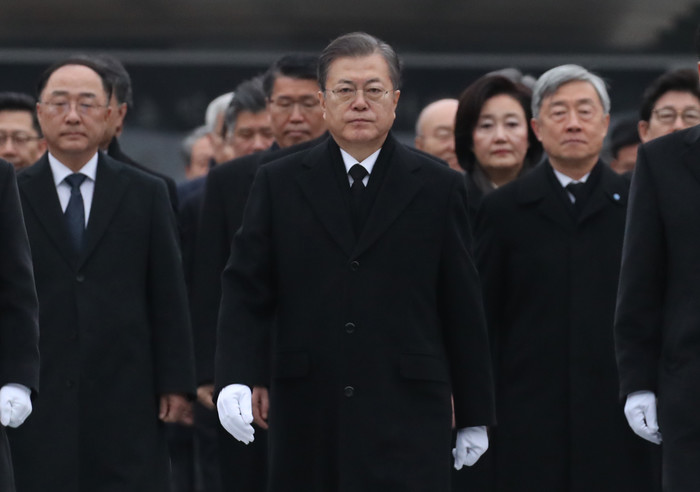 | ▲ 문재인 대통령이 국무위원, 청와대 수석비서관 등과 2일 오전 동작구 국립서울현충원에서 참배 뒤 나오고 있다. 연합뉴스 제공 |
