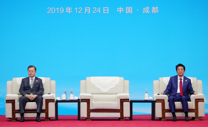 | ▲ 2019년 12월 24일 중국 쓰촨성 청두 세기성 박람회장에서 열린 한중일 비즈니스 서밋에서 문재인 대통령과 아베 신조 일본 총리가 리커창 중국 총리의 발언을 듣고 있다. 연합뉴스 제공 |