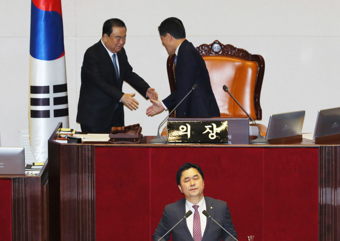 ▲ 문희상 국회의장(왼쪽)과 주승용 국회 부의장이 24일 국회 본회의에서 더불어민주당 김종민 의원이 '공직선거법 개정안'에 대해 무제한 토론하는 동안 의장석을 교대하고 있다. 연합뉴스 제공 |